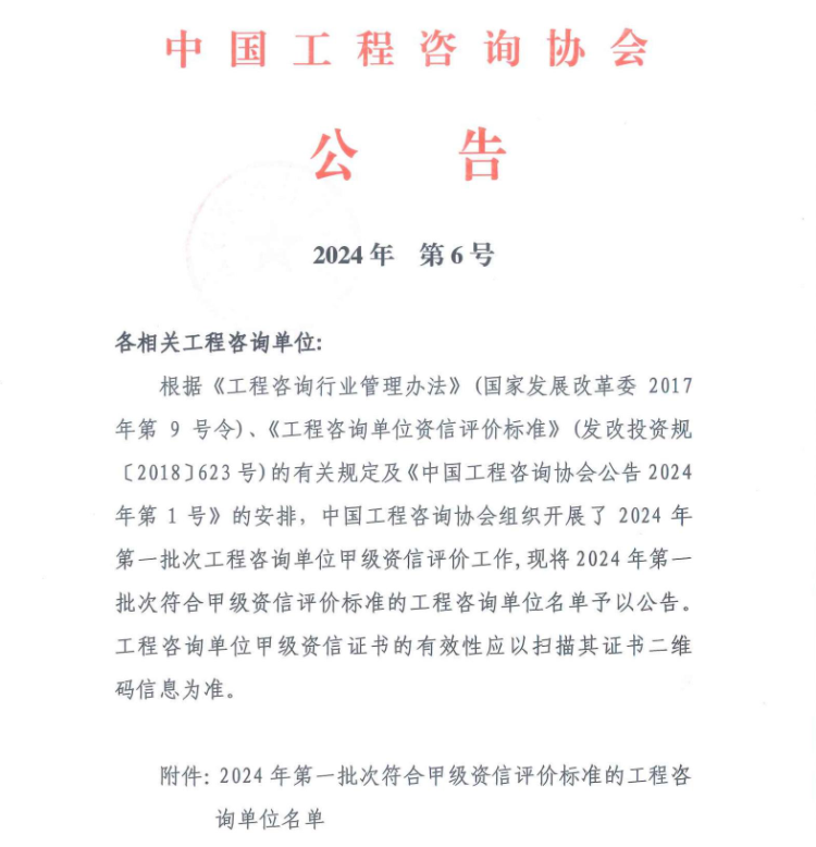 近日,成咨公司順利通過(guò)中國(guó)工程咨詢(xún)協(xié)會(huì)2024年第一批次工程咨詢(xún)單位甲級(jí)資信評(píng)價(jià),再次成為四川省唯一同時(shí)持有工程咨詢(xún)甲級(jí)綜合資信、PPP甲級(jí)專(zhuān)項(xiàng)資信和甲級(jí)專(zhuān)業(yè)資信的綜合性咨詢(xún)機(jī)構(gòu)。