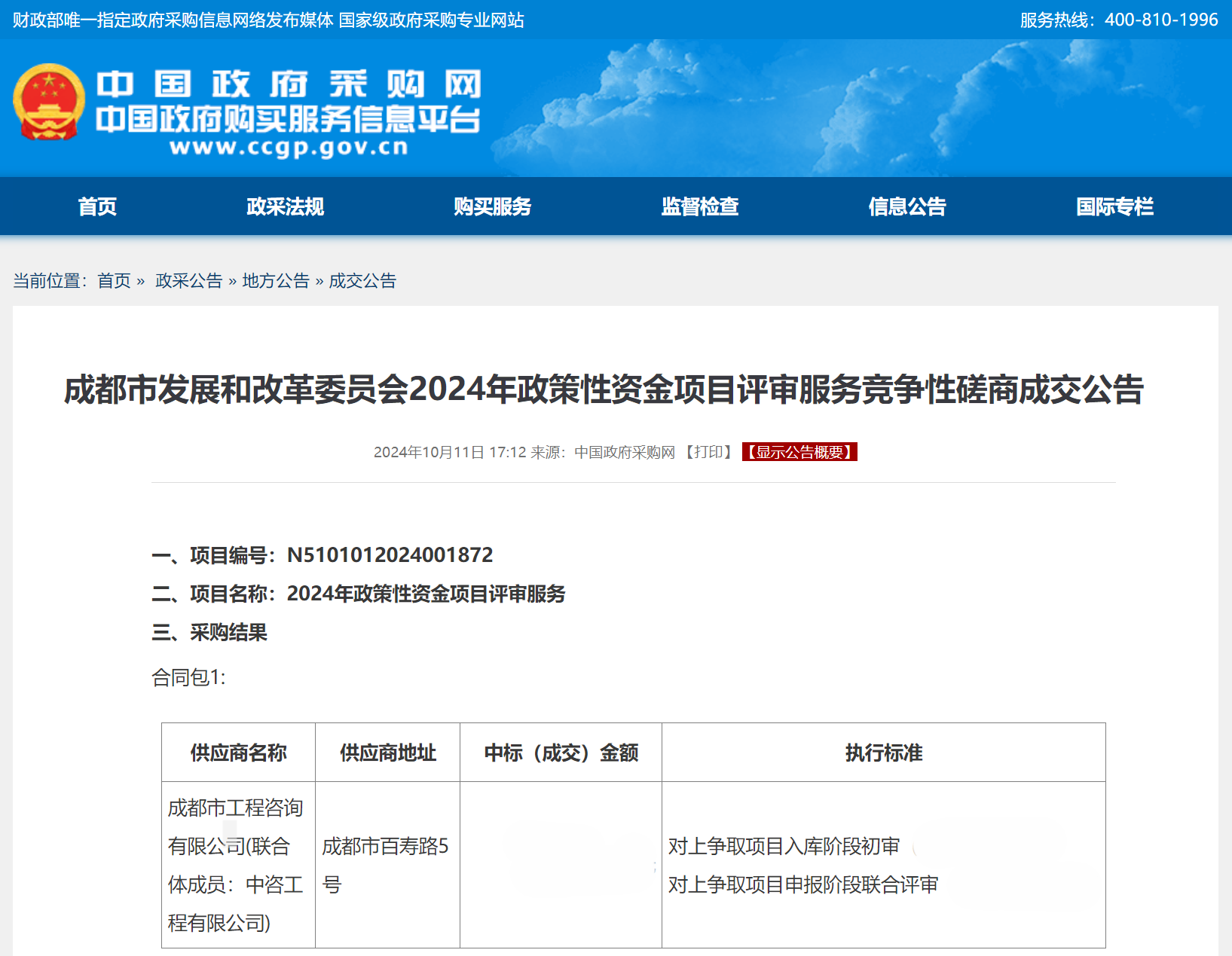 近期,成都工程咨詢有限公司和中咨工程有限公司聯(lián)合中標成都市發(fā)展和改革委員會2024年政策性資金項目評審服務。