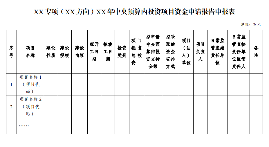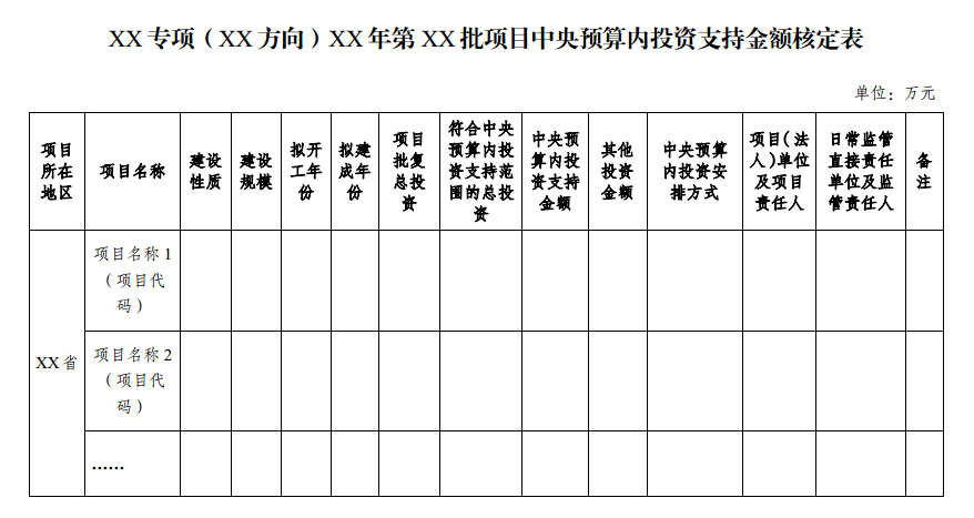 二、在附表中,應(yīng)當(dāng)明確每個(gè)項(xiàng)目的中央預(yù)算內(nèi)投資支持金額,并在“備注”欄中注明“本次批復(fù)資金申請(qǐng)報(bào)告”。