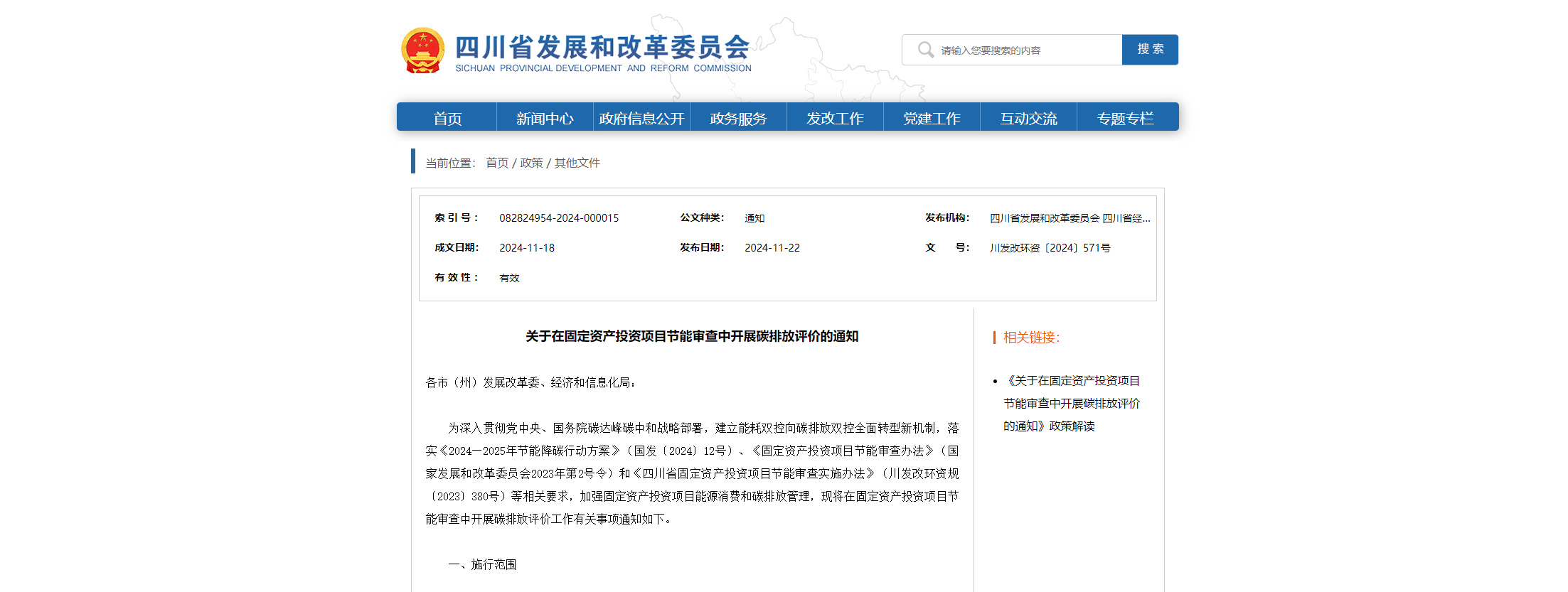 關(guān)于在固定資產(chǎn)投資項(xiàng)目節(jié)能審查中開(kāi)展碳排放評(píng)價(jià)的通知 各市(州)發(fā)展改革委、經(jīng)濟(jì)和信息化局:為深入貫徹黨中央、國(guó)務(wù)院碳達(dá)峰碳中和戰(zhàn)略部署,建立能耗雙控向碳排放雙控全面轉(zhuǎn)型新機(jī)制,落實(shí)《2024—2025年節(jié)能降碳行動(dòng)方案》(國(guó)發(fā)〔2024〕12號(hào))、《固定資產(chǎn)投資項(xiàng)目節(jié)能審查辦法》(國(guó)家發(fā)展和改革委員會(huì)2023年第2號(hào)令)和《四川省固定資產(chǎn)投資項(xiàng)目節(jié)能審查實(shí)施辦法》(川發(fā)改環(huán)...