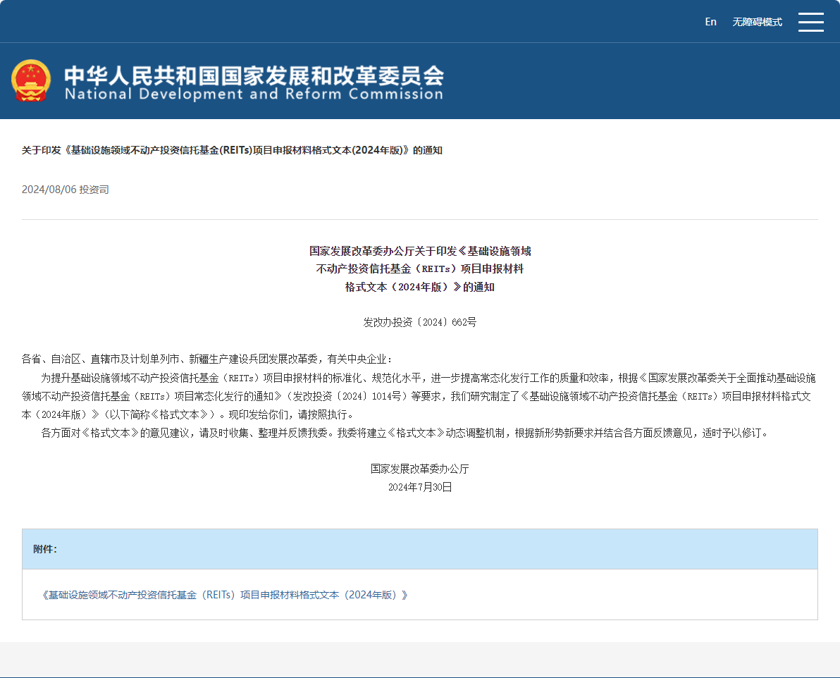 國家發(fā)展改革委辦公廳關(guān)于印發(fā)《基礎(chǔ)設(shè)施領(lǐng)域不動產(chǎn)投資信托基金(REITs)項目申報材料格式文本(2024年版)》的通知 發(fā)改辦投資〔2024〕662號各省、自治區(qū)、直轄市及計劃單列市、新疆生產(chǎn)建設(shè)兵團(tuán)發(fā)展改革委,有關(guān)中央企業(yè):  為提升基礎(chǔ)設(shè)施領(lǐng)域不動產(chǎn)投資信托基金(REITs)項目申報材料的標(biāo)準(zhǔn)化、規(guī)范化水平,進(jìn)一步提高常態(tài)化發(fā)行工作的質(zhì)量和效率,根據(jù)《國家發(fā)展改革...
